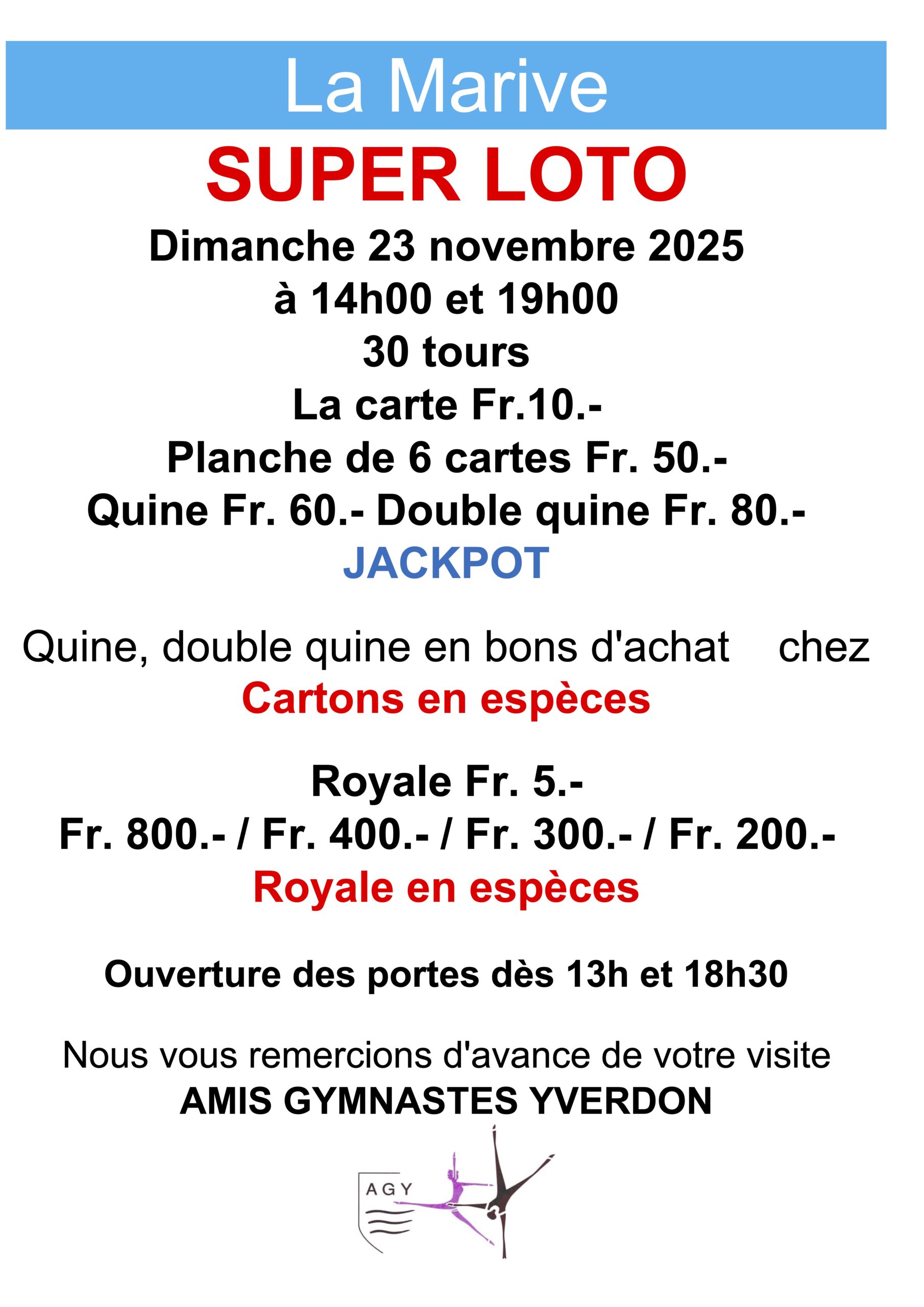 Le loto des Amis-Gymnastes Yverdon aura lieu à la salle de la Marive le dimanche 23 novembre 2025, dès 14 h. et 19 h.30 (ouverture des portes 13 h. et 18 h.30).