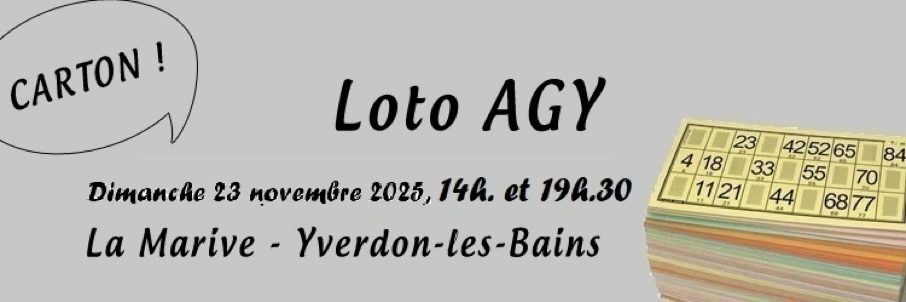 Le loto des Amis-Gymnastes Yverdon aura lieu à la salle de la Marive le dimanche 23 novembre 2025, dès 14 h. et 19 h.30 (ouverture des portes 13 h. et 18 h.30).